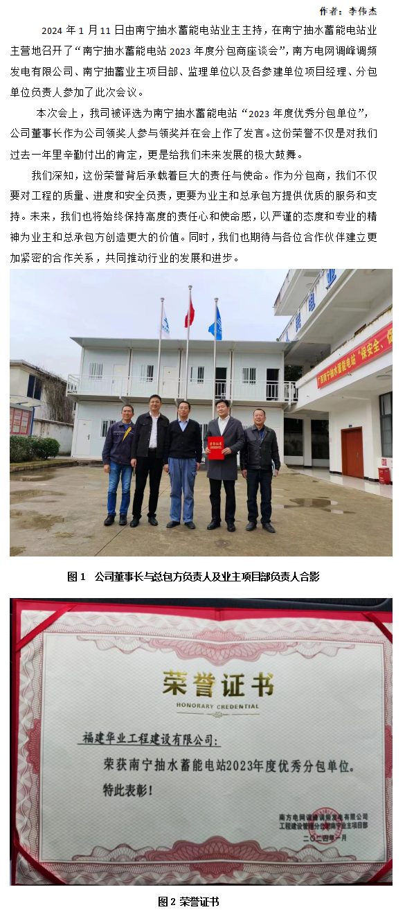 我司荣获南宁抽水蓄能电站“2023年度优秀分包单位”称号